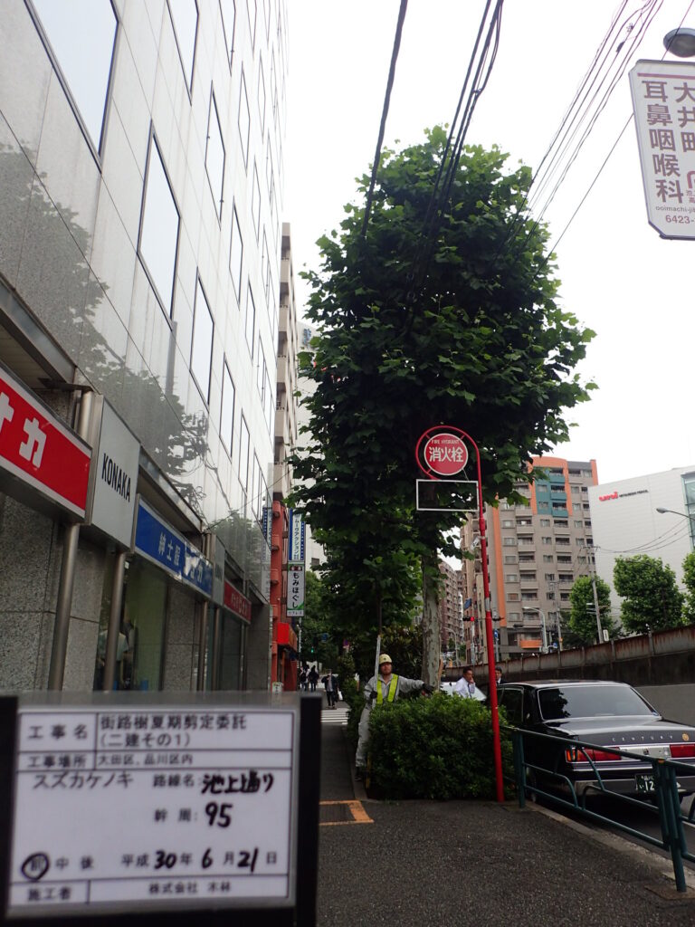 品川区と大田区内の都道の街路樹の夏期剪定作業です。街路樹夏期剪定作業は、日陰を歩道に残しながら全体を小さく整える剪定方法になります。